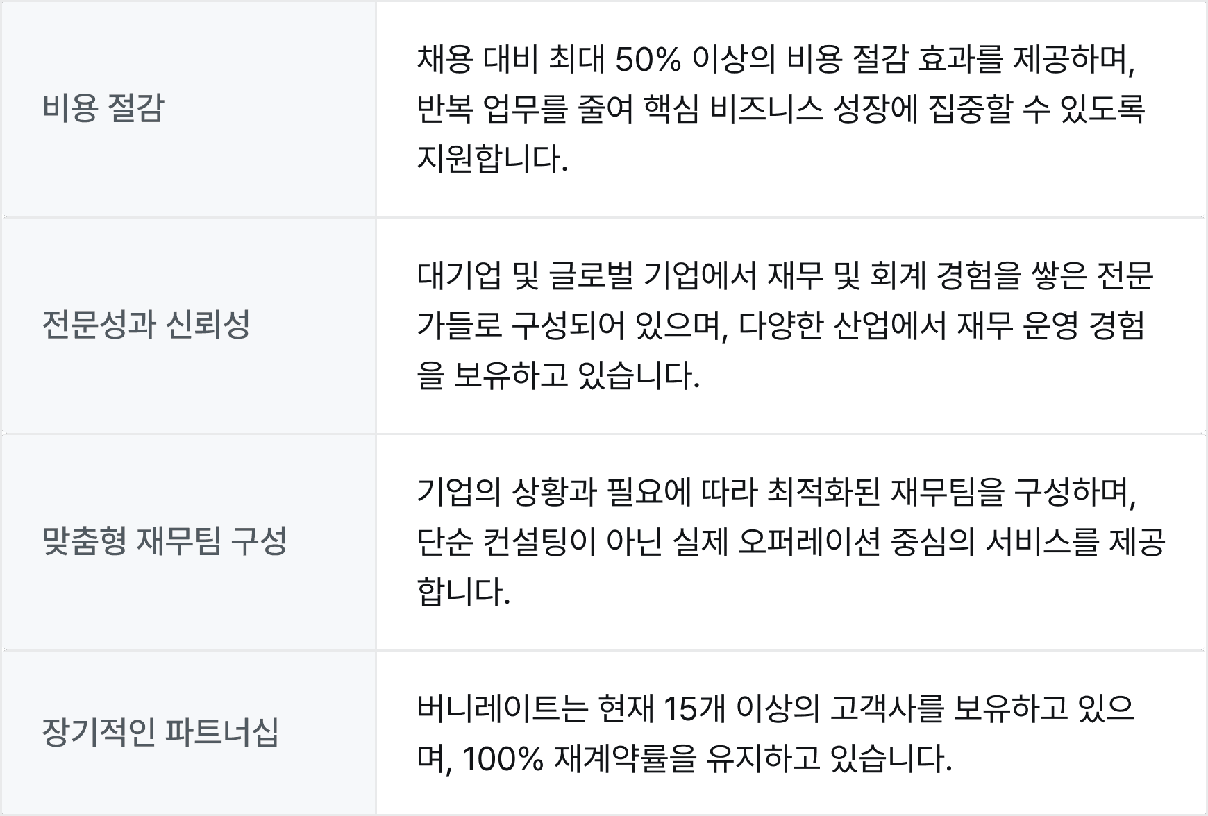 버니레이트는 스타트업 및 중소기업을 위한 재무팀 아웃소싱 서비스와 AI 기반 재무 자동화 소프트웨어를 결합하여 기업의 재무 관리를 혁신하는 파트너입니다.
